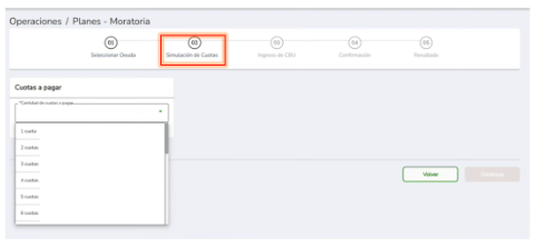Al seleccionar la opción “Continuar”, vas a acceder a la segunda etapa donde podrás simular la cantidad de cuotas a pagar: