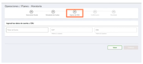 En la etapa 3, deberás informar una CBU donde se efectuará el débito de la cuota del plan: