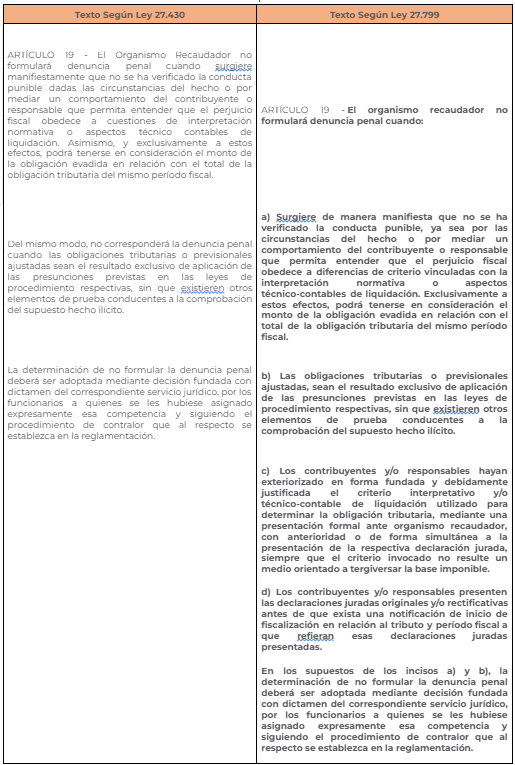 La Ley 27.799 introduce una reformulación del artículo 19 al ampliar y precisar los supuestos en los que el organismo recaudador debe abstenerse de formular denuncia penal. Mientras que la redacción anterior contemplaba estos casos de manera general, la nueva norma sistematiza los criterios y los enumera expresamente, otorgando mayor previsibilidad y seguridad jurídica.