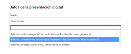 En este caso, la solicitud se realizará a través del servicio “Presentaciones digitales”, seleccionando el trámite “Solicitud de Reducción de Anticipos Impuesto a las Ganancias – Trámite Especial”.