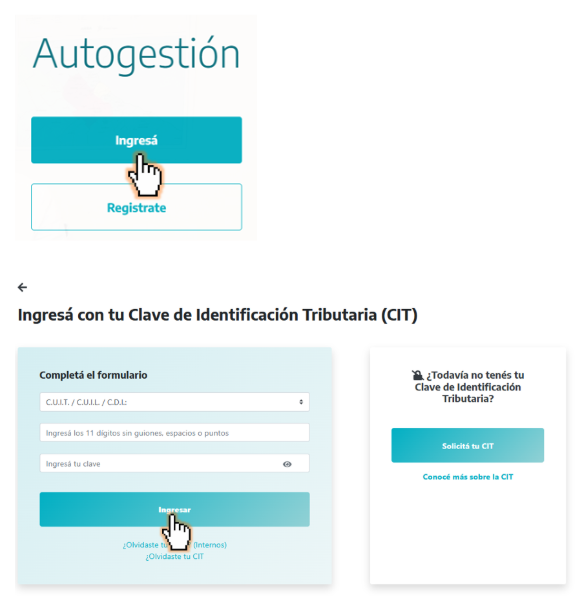 Deberás loguearte a través de la página web de la ARBA con tu CUIT y Clave de Identificación Tributaria (CIT) mediante la opción “Autogestión”: