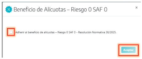 - El sistema te pedirá tildar el casillero “Adherir al beneficio de alícuotas – Riesgo 0 SAF 0 – Resolución Normativa 38/2025.” para completar la solicitud.