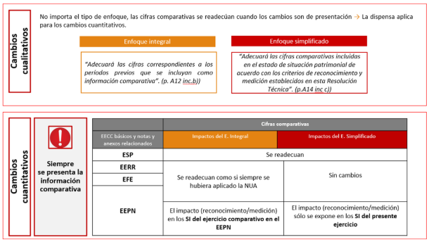 Por último, el párrafo A14 de las normas de transición de la RT 54 establece que la entidad “Adecuará las cifras que se incluyan como información comparativa de acuerdo con los criterios de presentación establecidos en esta Resolución Técnica u otras normas contables”. En consecuencia, cuando los cambios de política contable se limitan exclusivamente a aspectos de presentación, no se generan diferencias entre ambos enfoques, dado que la información comparativa debe readecuarse, en todos los casos, a los criterios de presentación previstos en la RT 54.